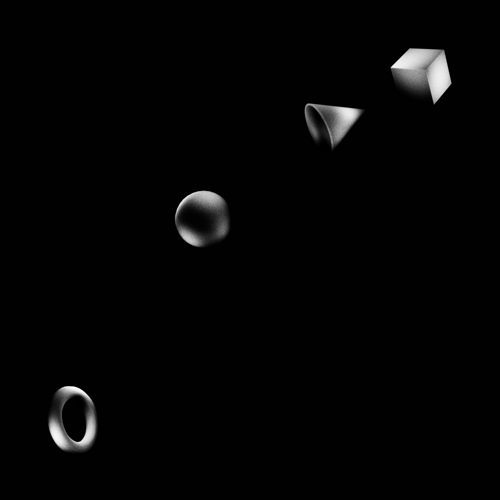 The music was a meandering, exploratory, and organic process, taking weeks and sometimes months to form a seed that would grow into a proper track. The visual language, though, was firmly realized from the start. Black and white. Fuzzy and glowing. Abstract and vast. The cube, sphere, cone, torus, and cylinder were essential guiding visual elements that formed after recording This Is in January 2022 (it was called Please Hold then). They came to influence and drive excursions into early computer-generated imagery showcases from Berkeley and oddball animated interstitials from local television stations in the 80's and 90's. The first few notes of the album beckon these five shapes, each representing a letter in the acronym HYCTV, the station from which the record, in its internal narrative, is being broadcast.